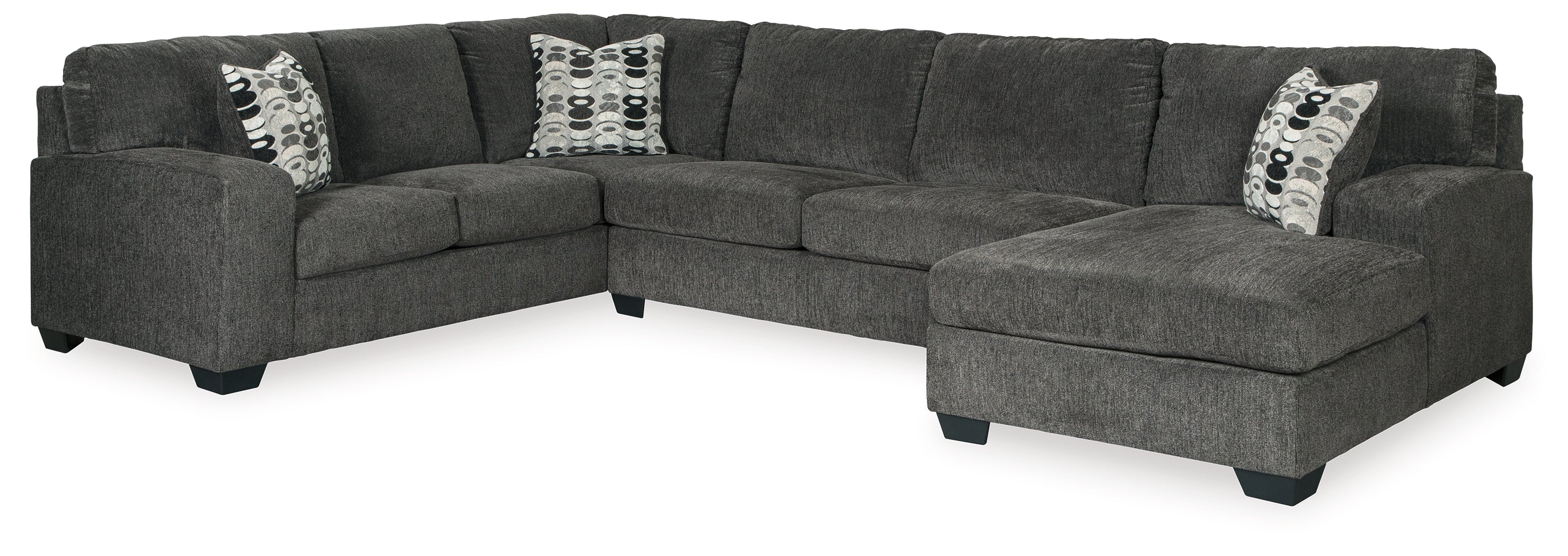 Includes 3 pieces: right-arm facing corner chaise, armless loveseat and left-arm facing sofa,