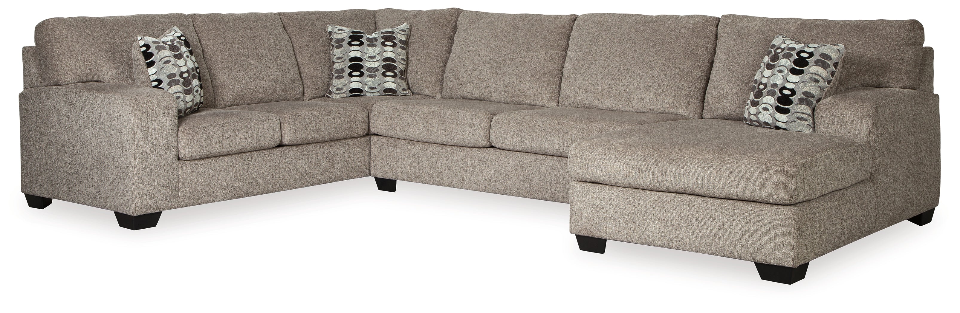 Includes 3 pieces: right-arm facing corner chaise, armless loveseat and left-arm facing sofa,