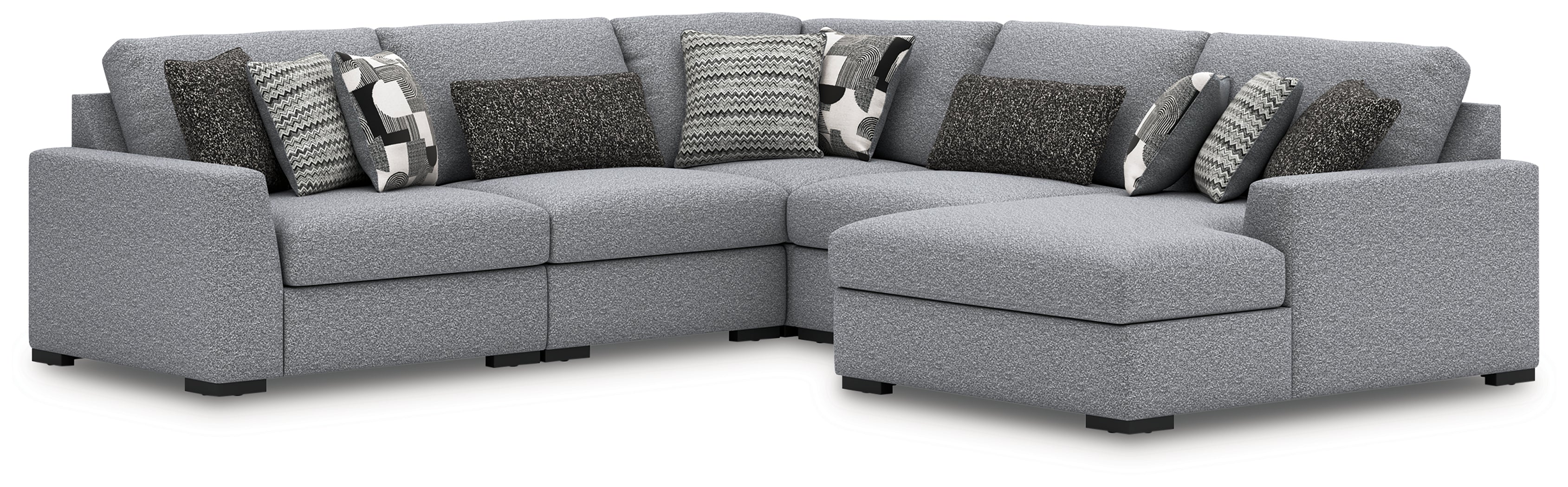 Includes 5 modular pieces: left-arm facing corner chair, 2 armless chairs, wedge and right-arm facing corner chaise,
