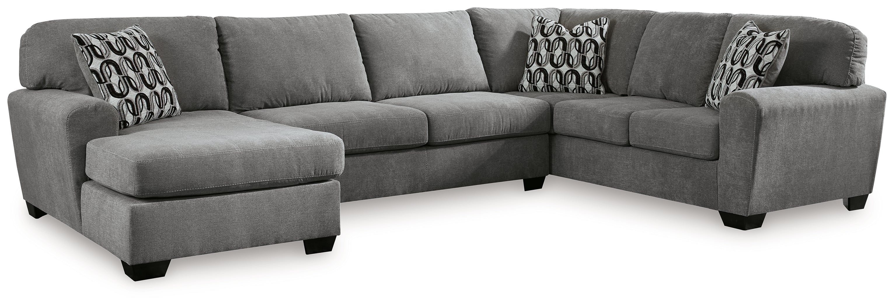 Includes 3 pieces: left-arm facing corner chaise, armless loveseat and right-arm facing sofa,