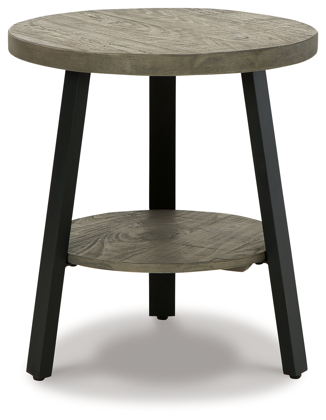 This round end table is an achievement in urban contemporary styling. Its ultra-cool design pairs a thick slab-style tabletop and an open lower shelf of solid pine wood with linear metal legs. A weathered gray finish keeps the aesthetic warm and inviting.