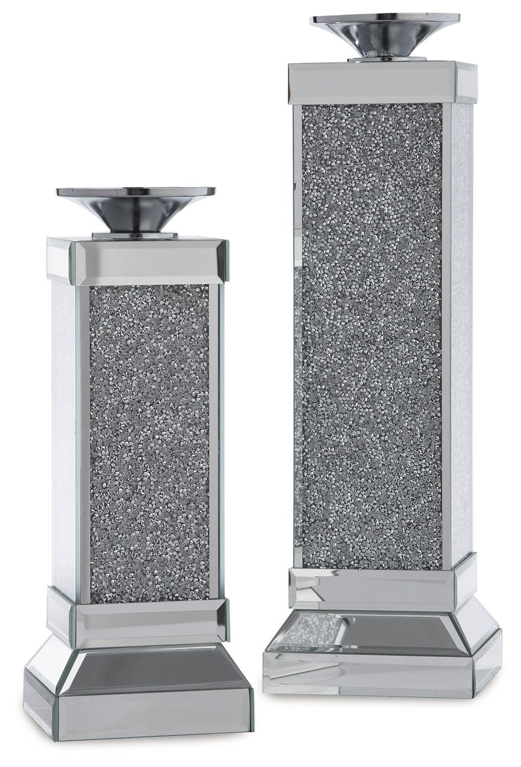 Add a touch of glamour to your accent table or mantle with this candle holder set. The cut-glass mirror base embellished with silvertone beaded accents will keep the candlelight dancing for hours.