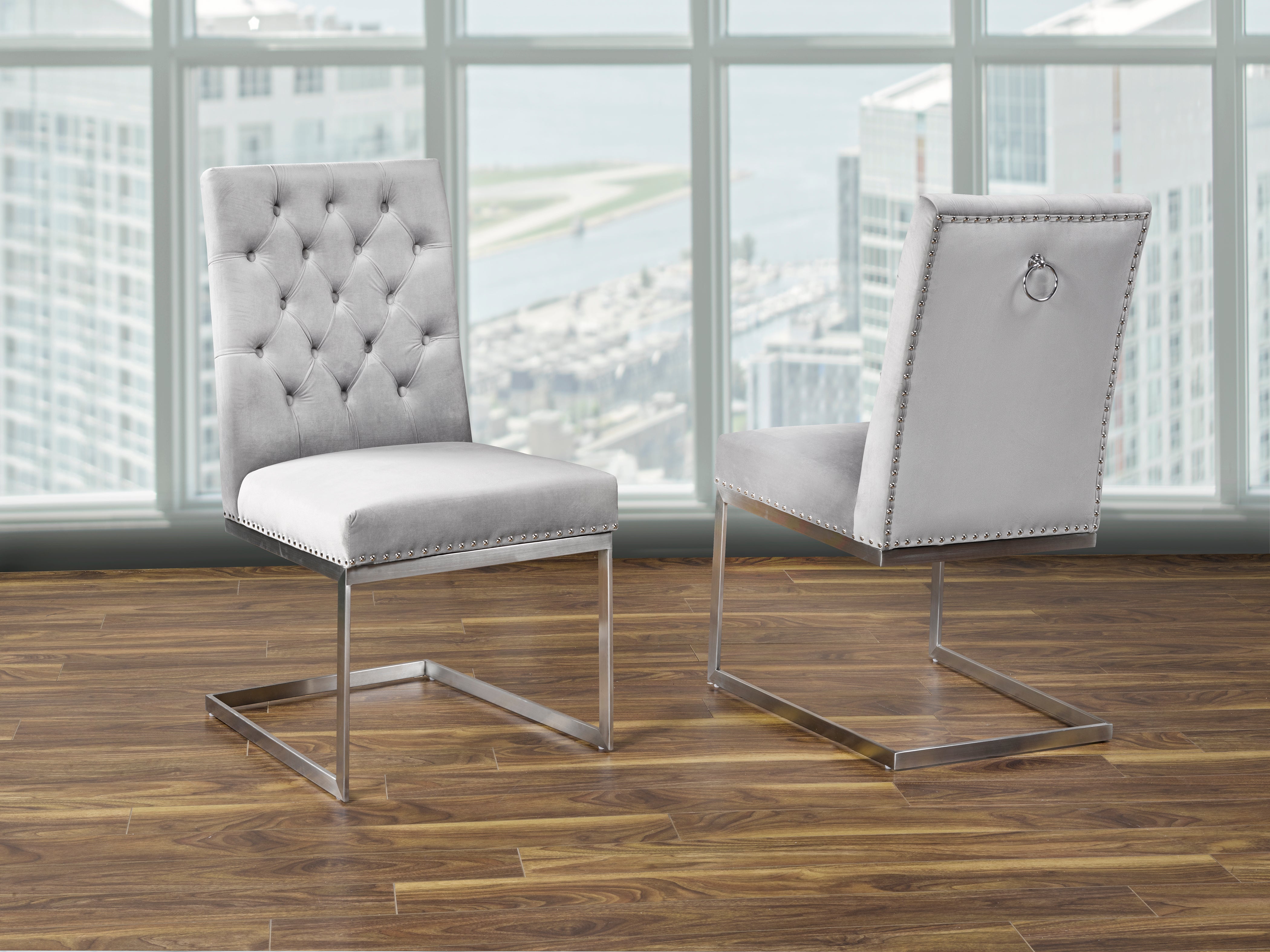 GREY TUFTED VELVET CHAIR W/ STAINLESS STEEL LEGS