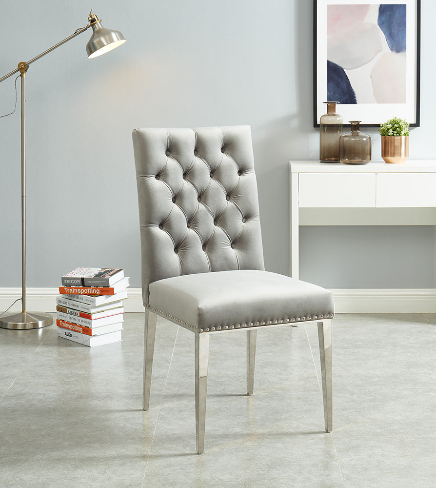 GREY TUFTED VELVET CHAIR W/STAINLESS STEEL LEGS