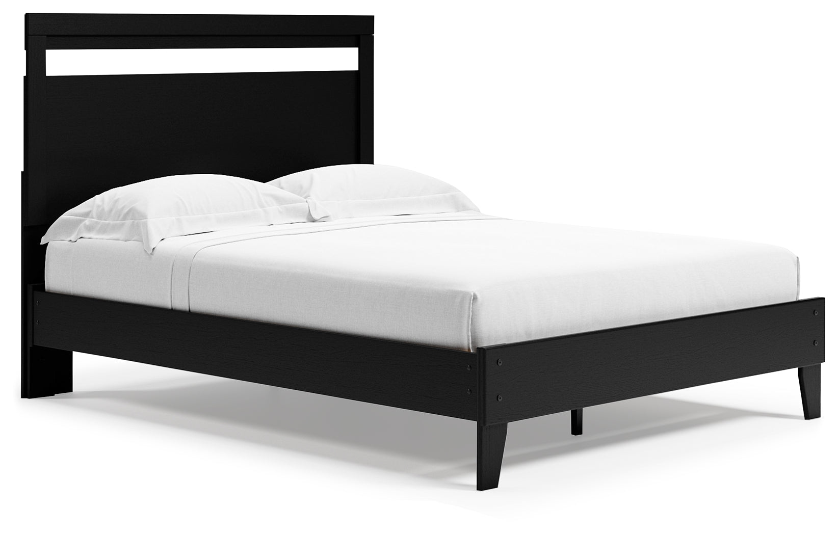 If you’re a fan of clean, crisp and contemporary interiors, rest assured this queen panel platform bed suits you. Its linear profile is enhanced with a matte black finish with subtle replicated wood grain. The headboard\'s peekaboo cutout adds a cut-above element. Hard to believe such a high-style aesthetic can be so attractively priced. Best of all, our innovative bed-in-a-box shipping system delivers your new bed right to the door.