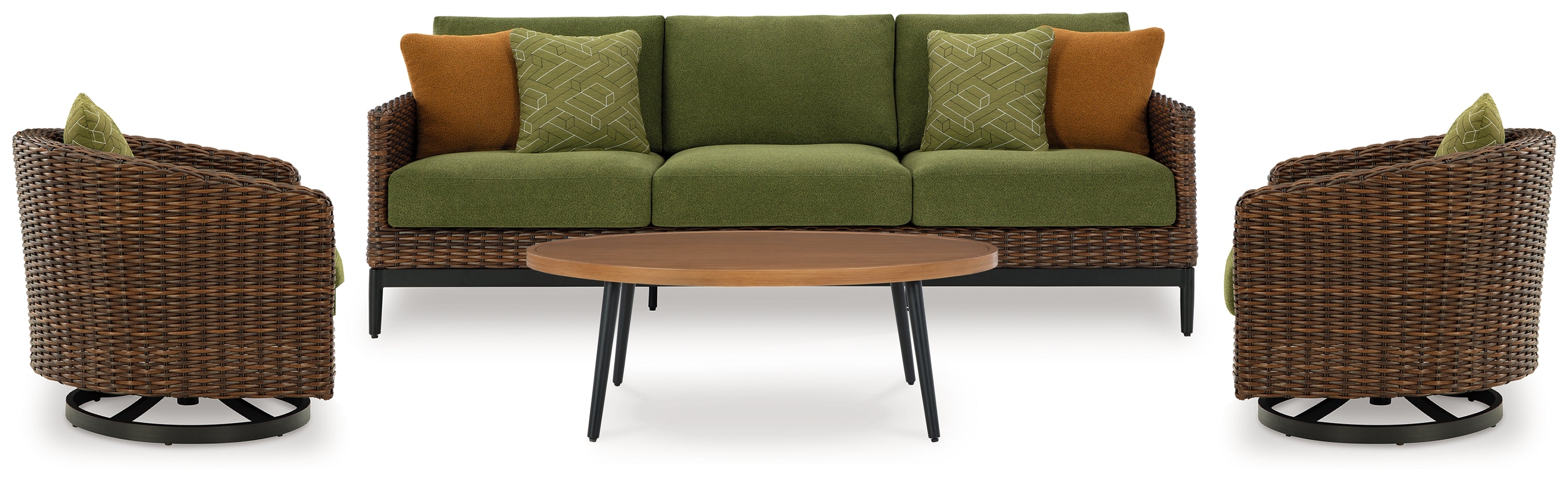 This outdoor package recalls the aesthetics of nature to bring an inviting, high-style feel to your patio or lanai. Its Nuvella+™ performance fabric is made with enhanced UV resistance, so the chic green hue stays brighter for longer. Worried about the weather? Don’t sweat it—this set\'s durable design is made to withstand the elements from season to season.