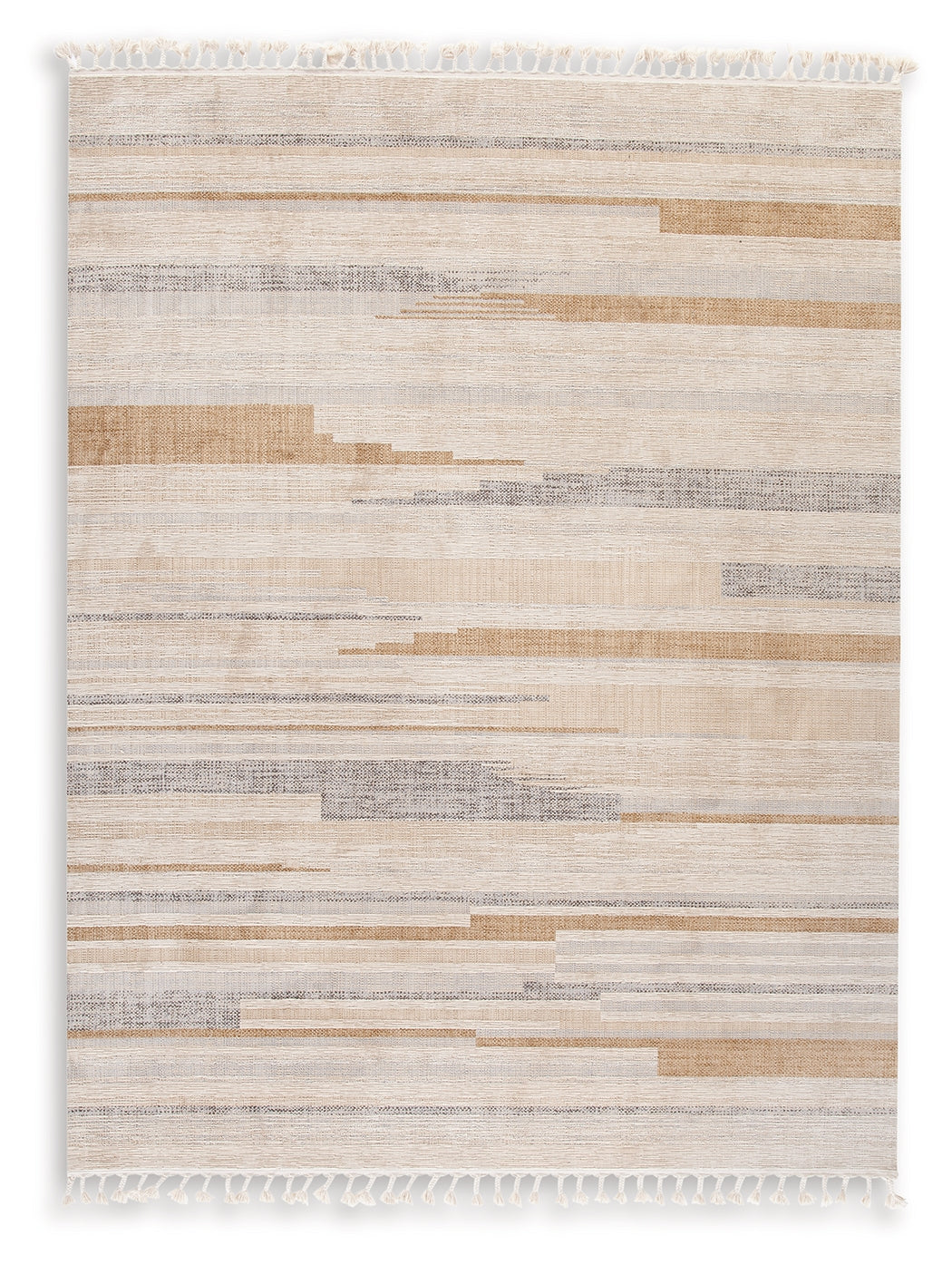 Linear imagery and neutral hues in this area rug evoke a casual-chic vibe just perfect for modern, contemporary interiors. Soft comfort underfoot delights the senses and the finished tassel edges add just what you need for a subtle focal point wherever it’s displayed.