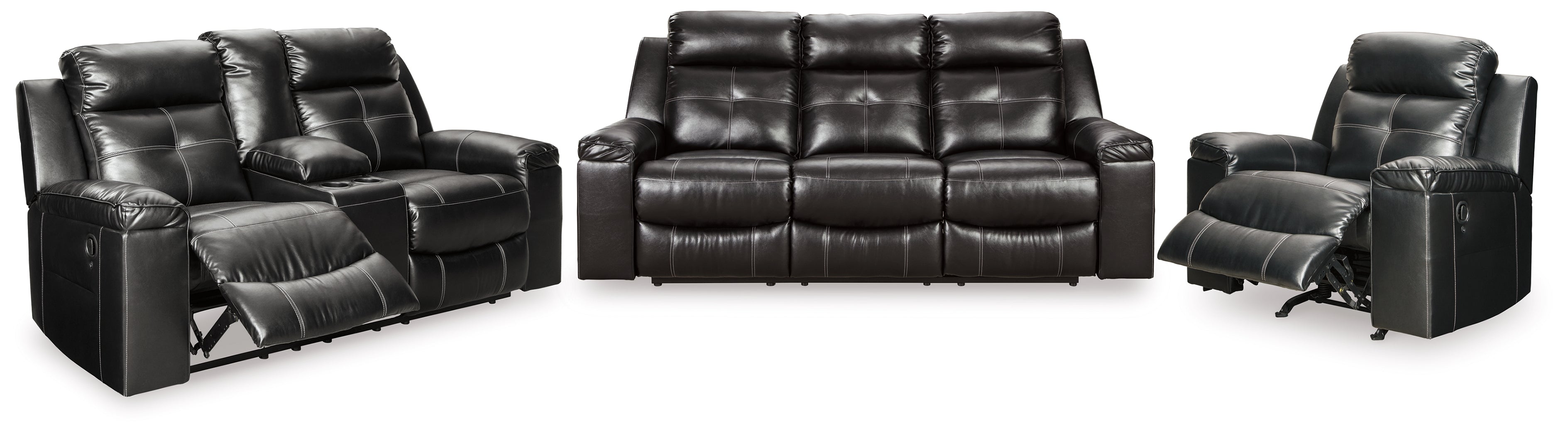 You don’t just want to recline. You want to recline in high design. Wrapped in a fabulous black faux leather upholstery, this reclining sofa with 42\" high back is everything you long for—and then some. Ultra clean lines, subtle curves and sumptuous comfort make it a sight for sore eyes and tired muscles. Here’s the showstopper: ambient blue LED lighting along the sofa base for a movie theater experience enjoyed from the convenience of home. Matching reclining loveseat and recliner included.