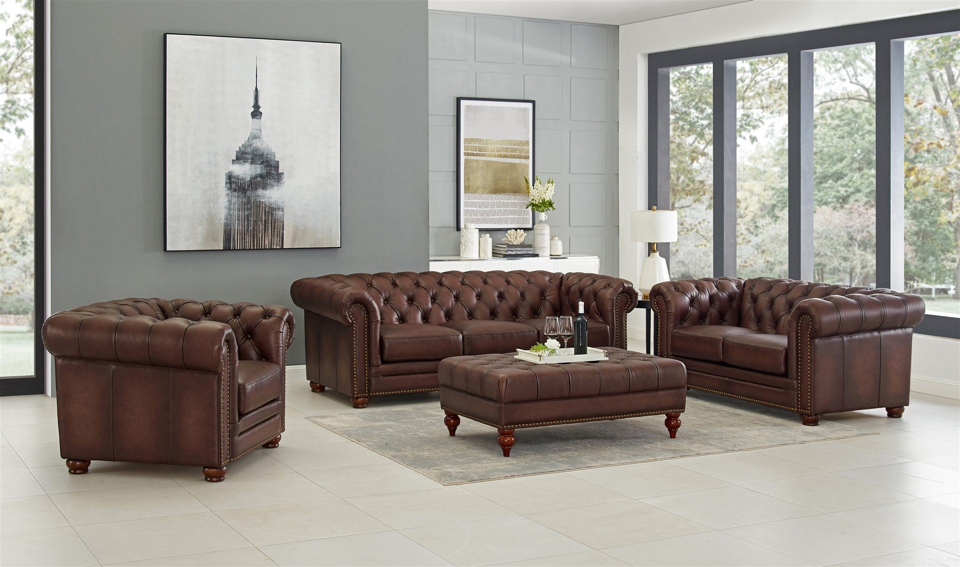 Kennedy leather stationary collection is exquisite in design with full back and arm diamond tufting and brass nail head trims. The hand-finishing leather with multi-tone effect complements the overall rich look. This collection is not only about style, down feather seating cushions offer you lasting performance.