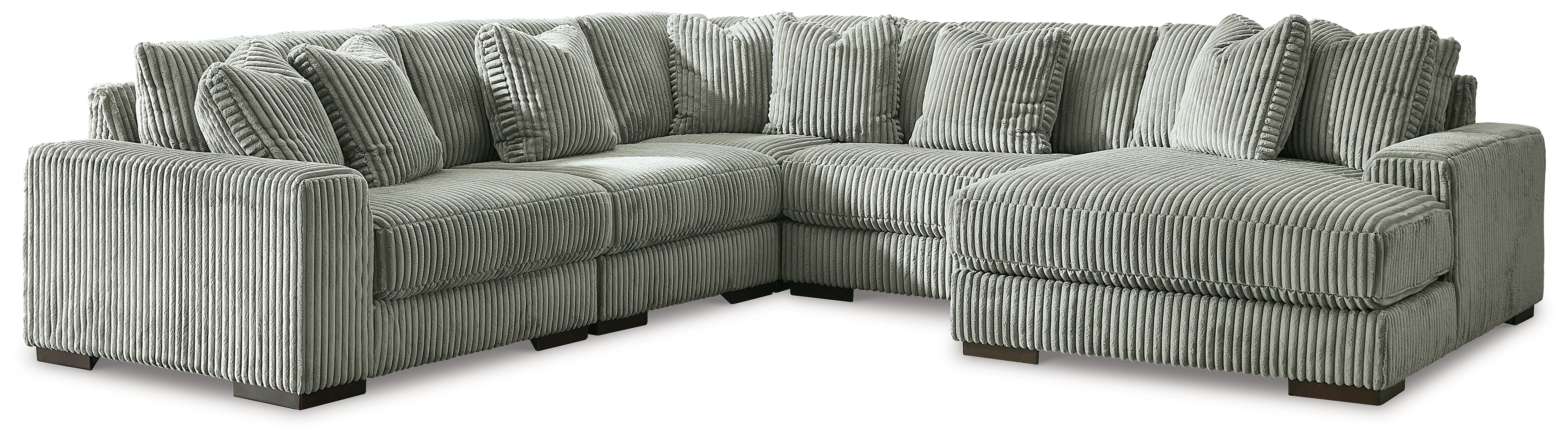 Plush and posh. Showcase your eye for on-trend texture with the statement-making cord upholstery of this sectional with chaise. Its stunningly soft fabric entices in a warm neutral hue, complementing contemporary color palettes. Sink into the cushions and plan to stay a while—this cozy living room centerpiece highlights your high-end approach to comfort and style.