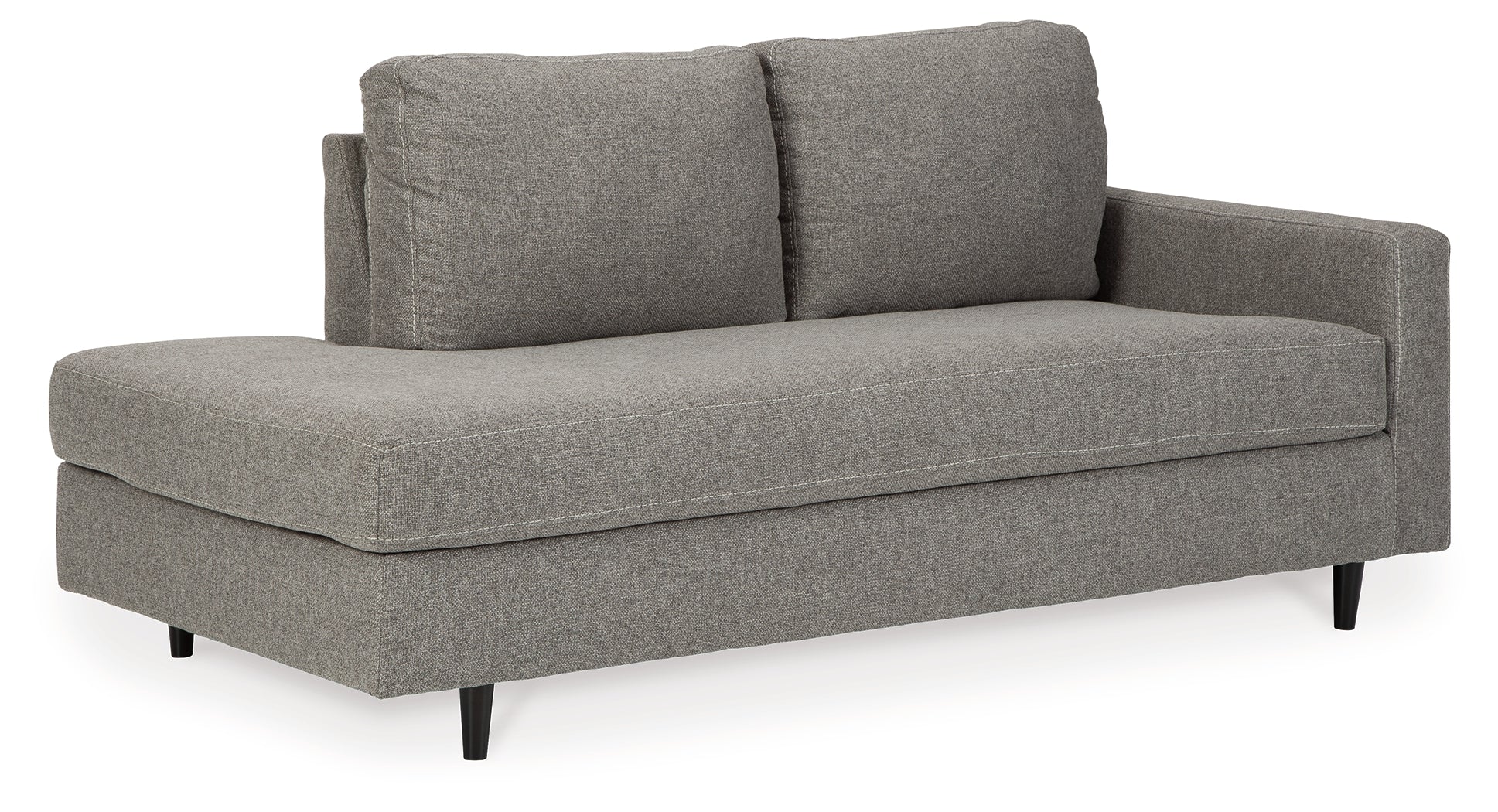 Mixing mid-century inspiration with modern attitude, this right-arm facing chaise is as retro chic as it is fashion forward. Loaded with multi-tonal interest, the granite gray upholstery is the essence of earthy elegance. Design elements include slim track arms and tapered accent legs that are right on point.