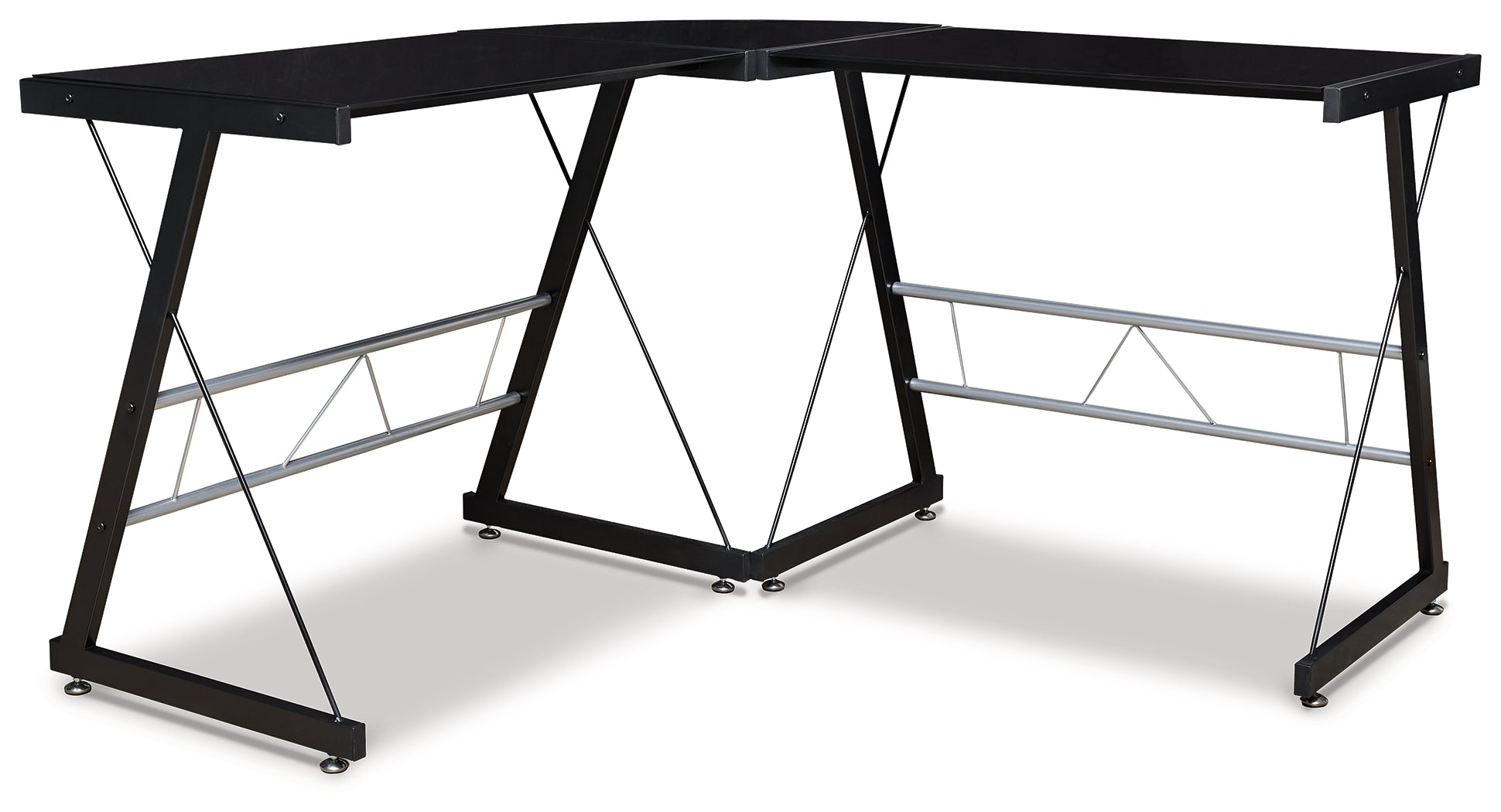 Bring a midtown feel to your office with this L-desk. The three-piece modular desk can easily transform a small space or spare bedroom into a stylish work-from-home environment. With a satin black powder coated finish and contrasting chrome-tone stretchers, this desk makes a bold statement while providing ample work space.