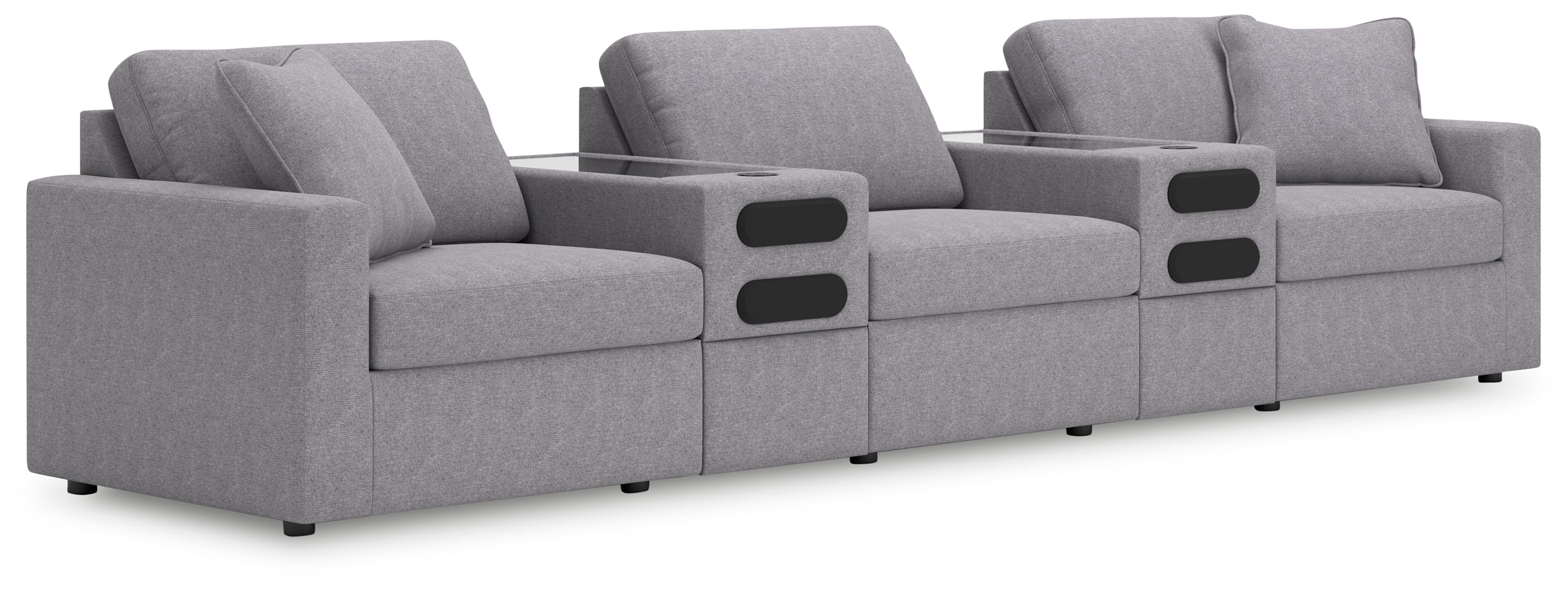 Includes 5 modular pieces: left-arm facing corner chair, armless chair, 2 audio consoles with storage and right-arm facing corner chair,