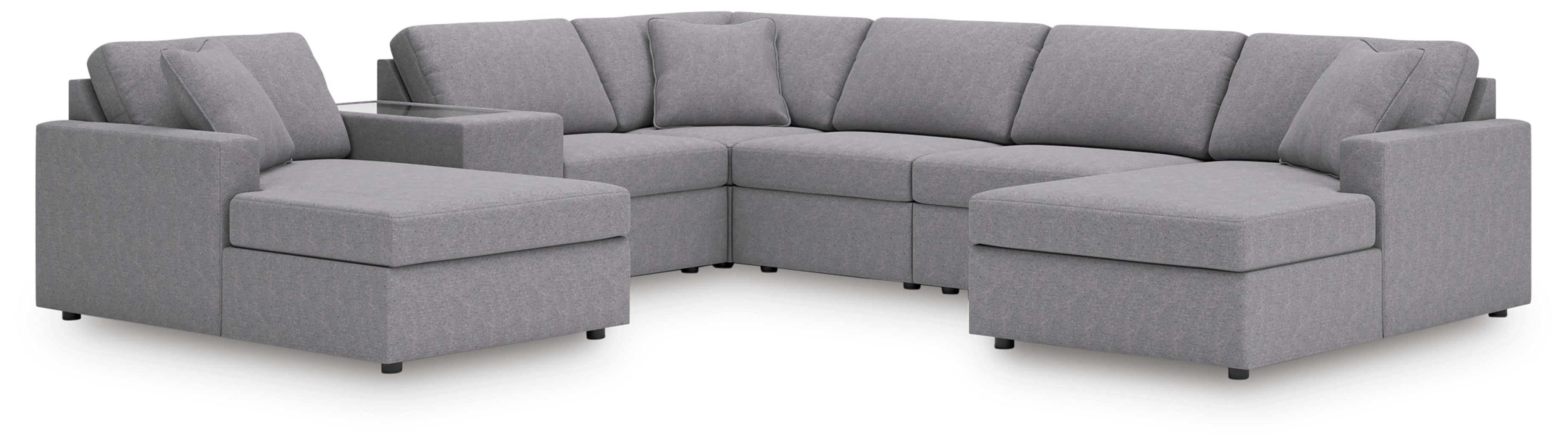 Includes 7 modular pieces: left-arm facing corner chaise, 3 armless chairs, console with storage, wedge and right-arm facing corner chaise,