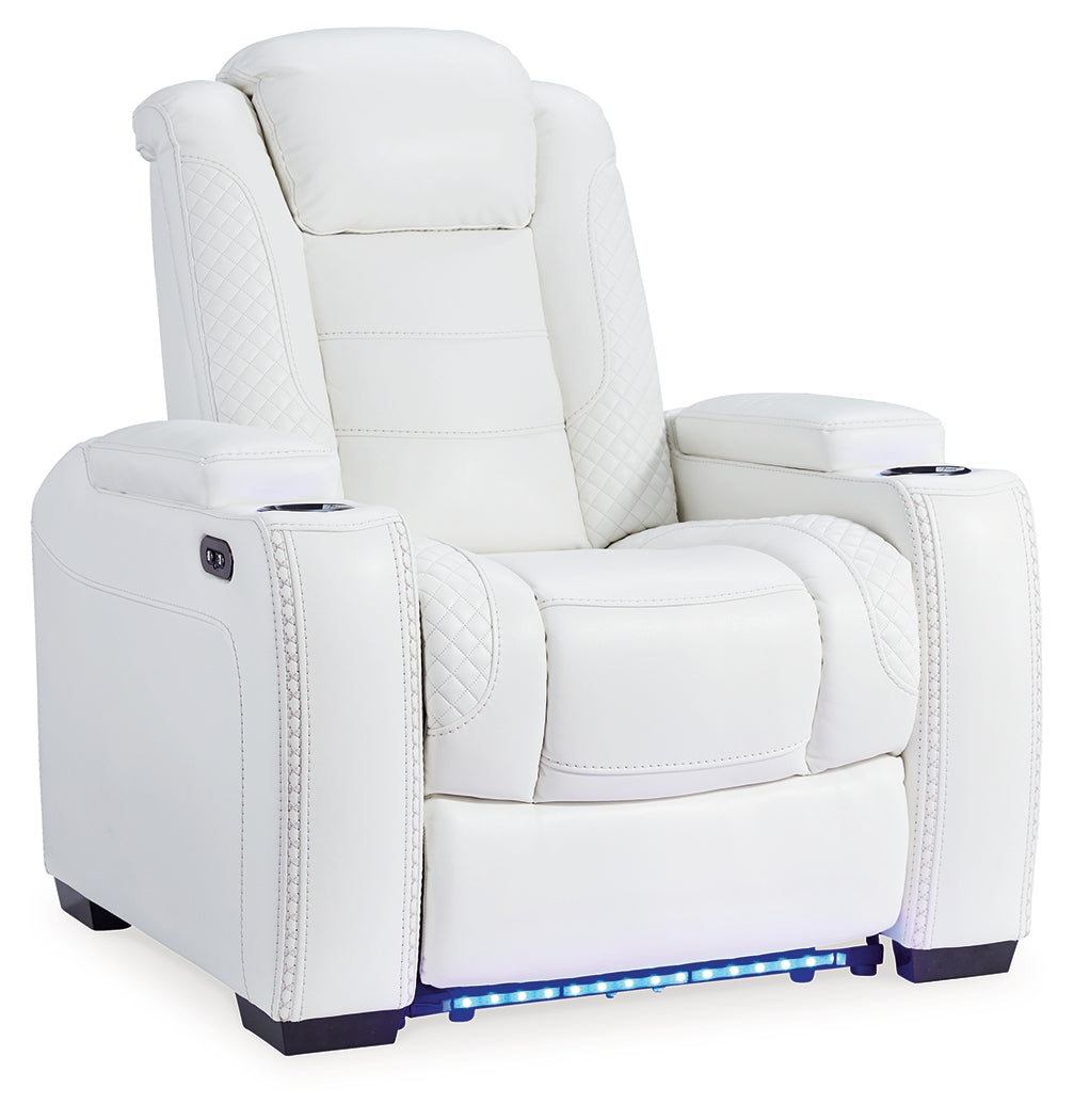 This power recliner takes its cue from luxury automobiles with lattice- and cross-hatch stitching, for a richly tailored aesthetic that gives you plenty of reasons to celebrate. Sumptuously padded cushions and dramatic midnight black faux leather upholstery add to the indulgence. When it’s time to rev up the action, the recliner’s reclining bucket seat, Easy View™ power adjustable headrest and USB charging port keep you in the driver’s seat.