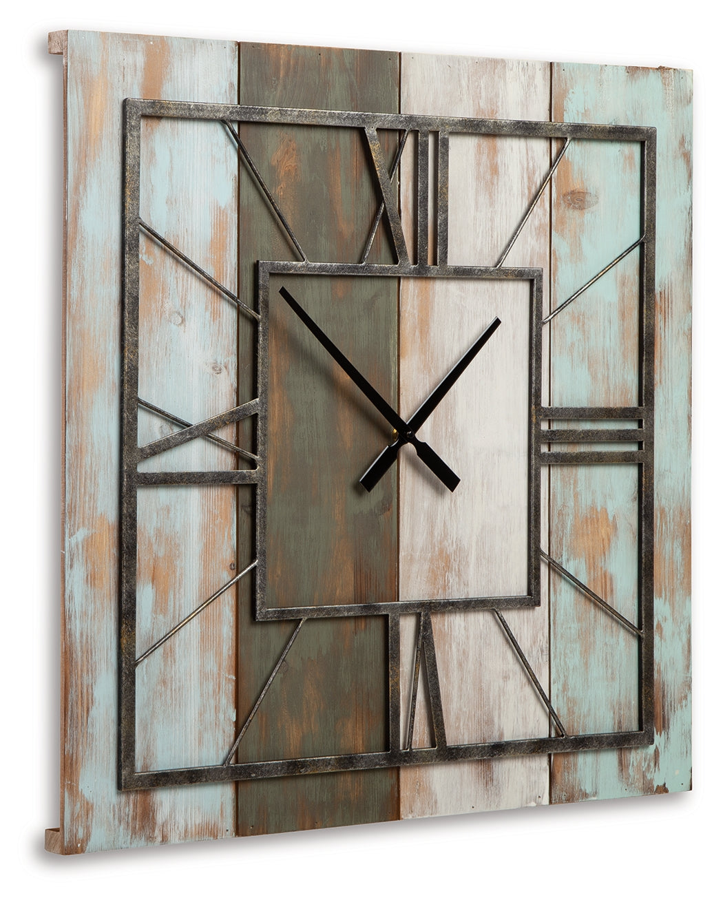 Merging modern and vintage style, this wall clock brings both style and function to your home. An antiqued metal frame makes the Roman numerals pop for easy reading. The look is rounded out with antiqued blue, gray and white finished wood backing.