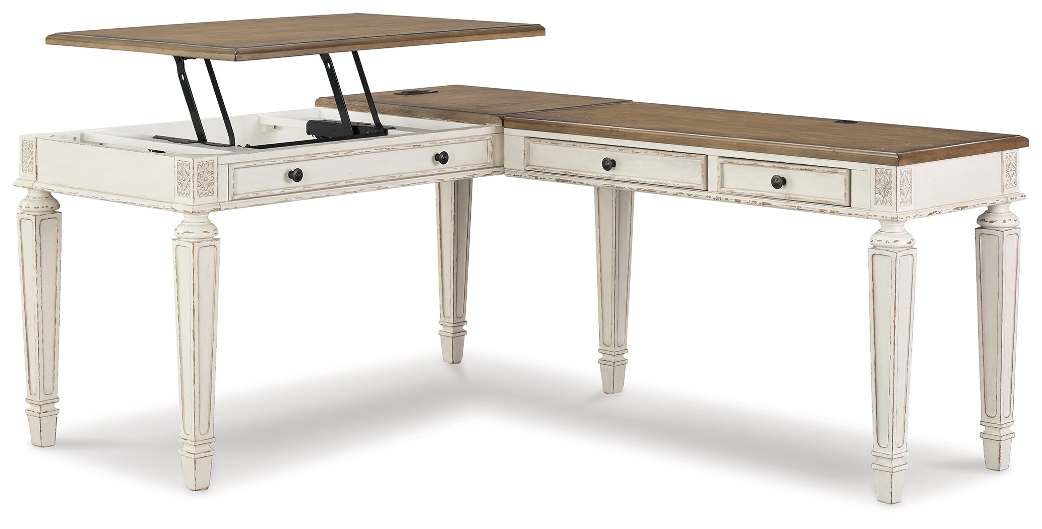 Elevating the art of traditional cottage styling, this L-shaped desk is your heavenly home office realized. Its two-tone finish combines chipped white with distressed wood tone tops for added charm. Framed drawer fronts, decorative corbels and elegantly turned and tapered legs add refinement, while dark bronze-tone knobs lend a classic touch. And this desk is also built for productivity. A spring lift top raises the surface to a comfortable standing position, while the built-in power supply and dual USB ports keep your devices close at hand and ready to go.