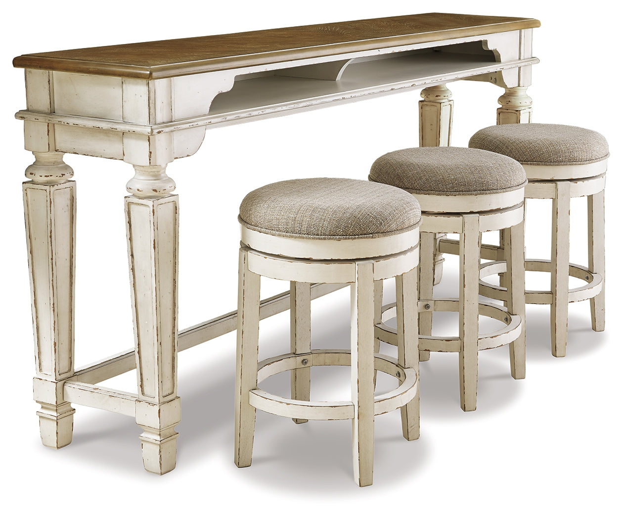 Stretch the possibilities of traditional cottage design with this 4-piece dining set. The slim, stylish table with dual open cubbies is perfectly scaled for large and small spaces alike. Place behind a sofa or sectional to enhance your entertainment area or serve up a place for casually cool dining. Its antiqued two-tone aesthetic pairs a chipped white with distressed wood finished top for twice the charm. Three counter height bar stools are enriched with a chipped white finish and topped with a comfortably cushioned seat covered in textured oatmeal-tone fabric.