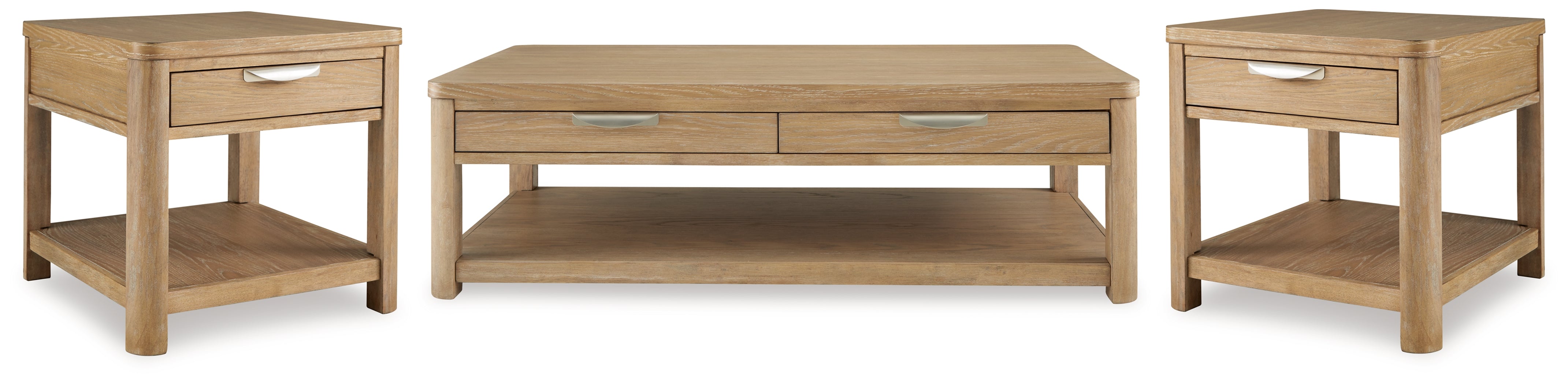 This coffee table\'s classic yet contemporary good looks are hard to deny. Softly shaped posts with a light oak finish and wire-brushed wood grain texture lend an organic appeal to your soothing space. Roomy drawers cater to additional storage needs while keeping clutter at bay. Plus there\'s plenty of display space on the lower shelf for, ahem, coffee table books. 2 Matching end tables included.