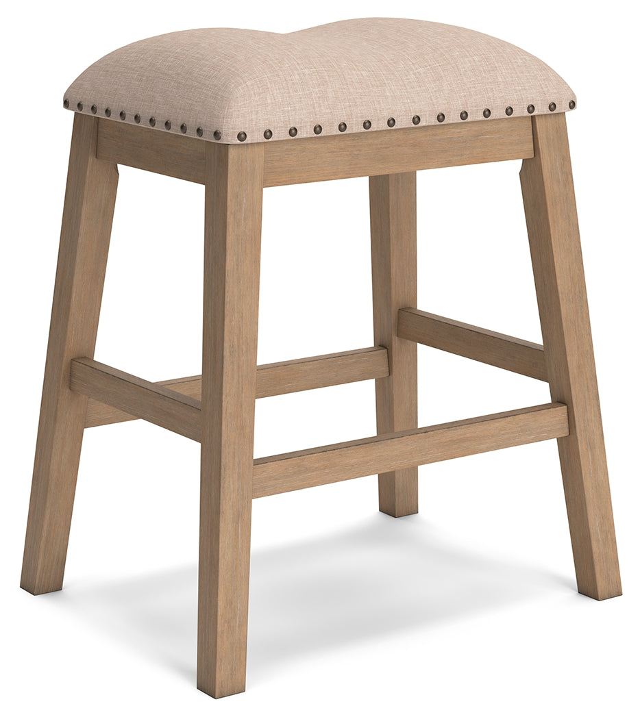 Show off your taste for charmingly curated style with this counter height bar stool. Its clean-lined design sports a neutral upholstered seat punctuated by nailhead trim for modern farmhouse flair. A light, natural finish on the frame inspires delightfully carefree dining.