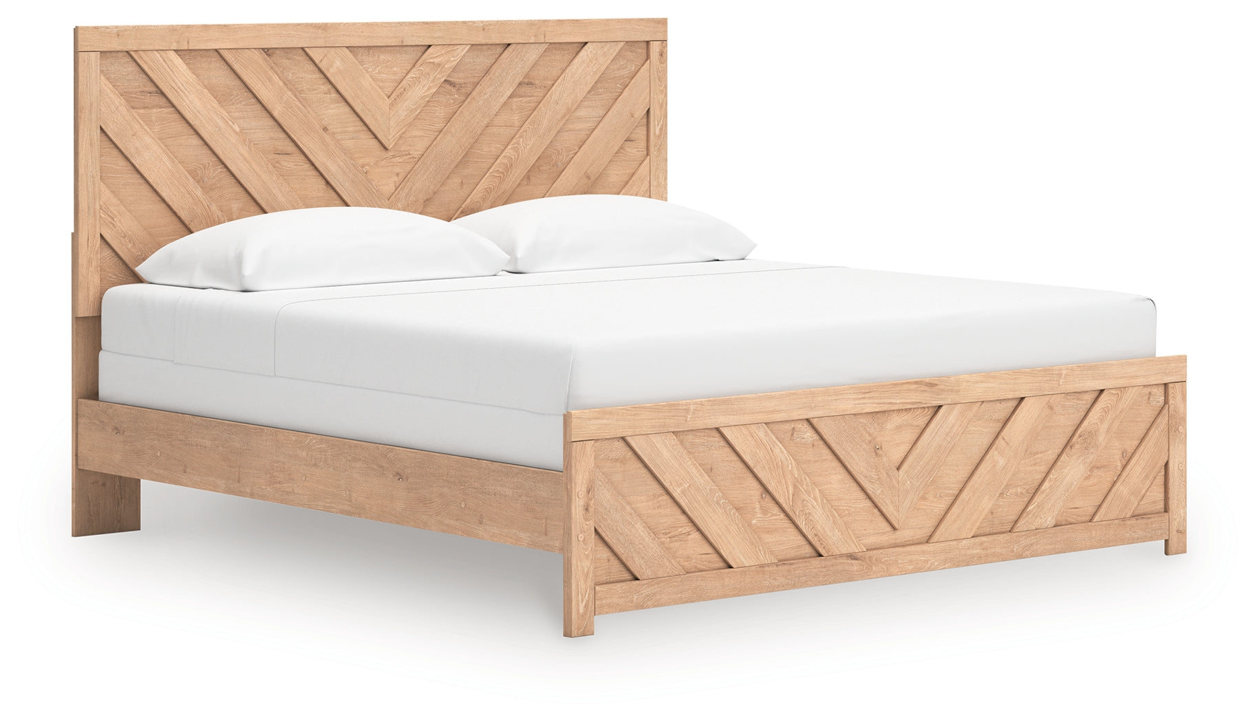 This king panel bed brings a touch of modern farmhouse charm to your home. Its light oak finish and clean lines have a fresh, airy feel, effortlessly creating an inviting atmosphere for a restful night’s sleep. A striking chevron pattern adds texture and visual interest for a fresh take on country living.