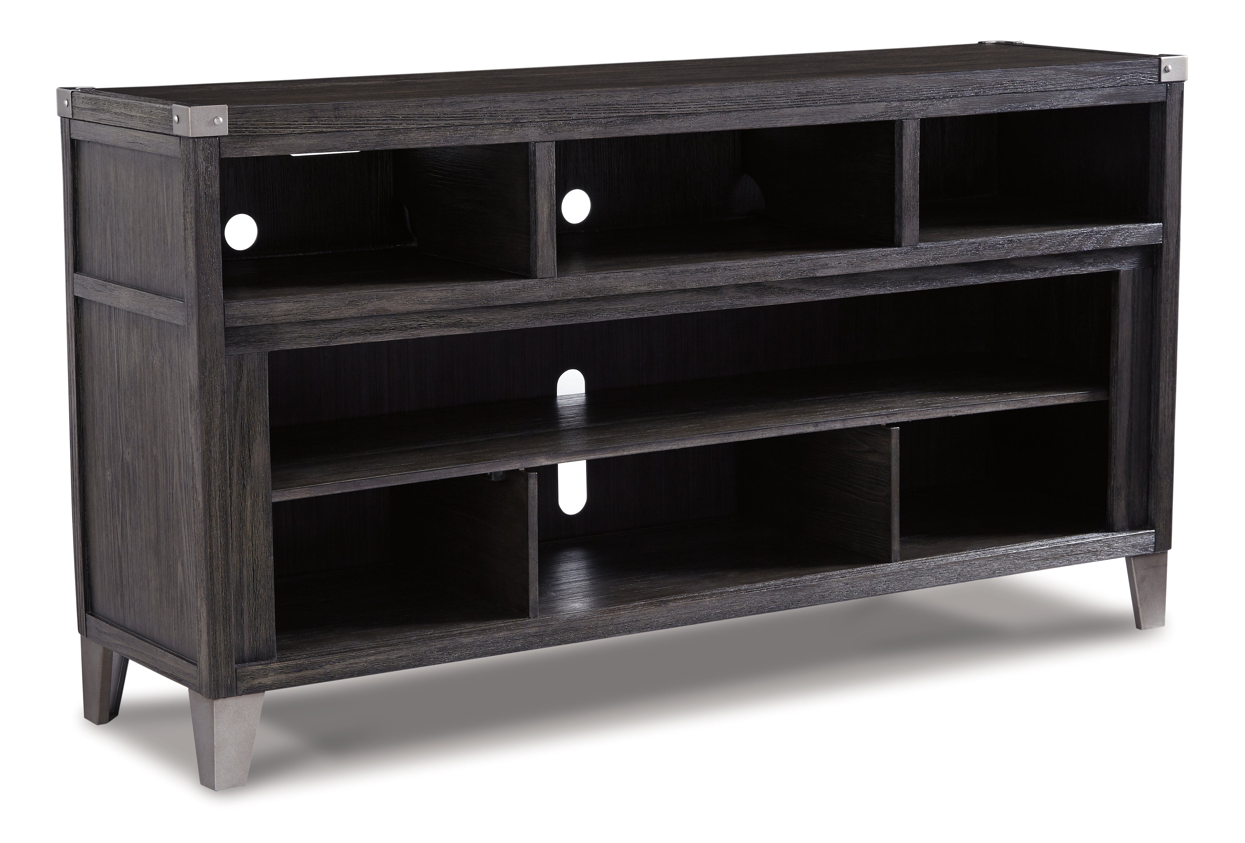 Make watching TV a joy. This TV stand\'s rustic-industrial style—with a gray finish, squared edges, zinc-tone corner bracket accents and nailhead detailing—is sure to complement any contemporary decor. Several vented open cubbies offer impressive shelf space, convenient for keeping all of your electronic gear within reach. Handy cutouts keep cords out of sight. The stand\'s large center opening accommodates a shelving insert (included) or an optional fireplace insert (sold separately).
