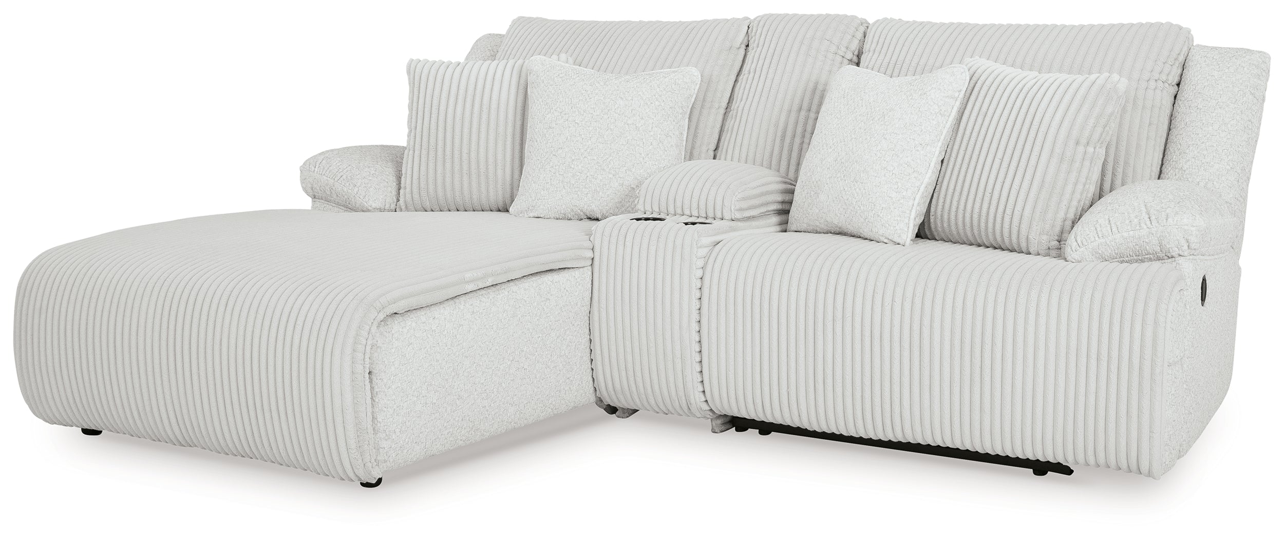 Includes 3 pieces: left-arm facing press back chaise, console with storage and right-arm facing recliner,
