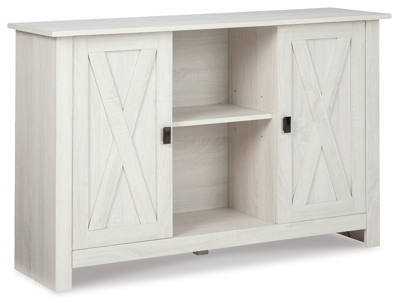 Casual and vintage style meet to make this accent cabinet. Two open storage cubbies allow you to feature decorative pieces or photographs and additional concealed space behind two doors provides an excellent storage solution. The crossbuck pattern door front adds a vintage feel, while the antiqued white wood laminate makes this a versatile addition to your space.