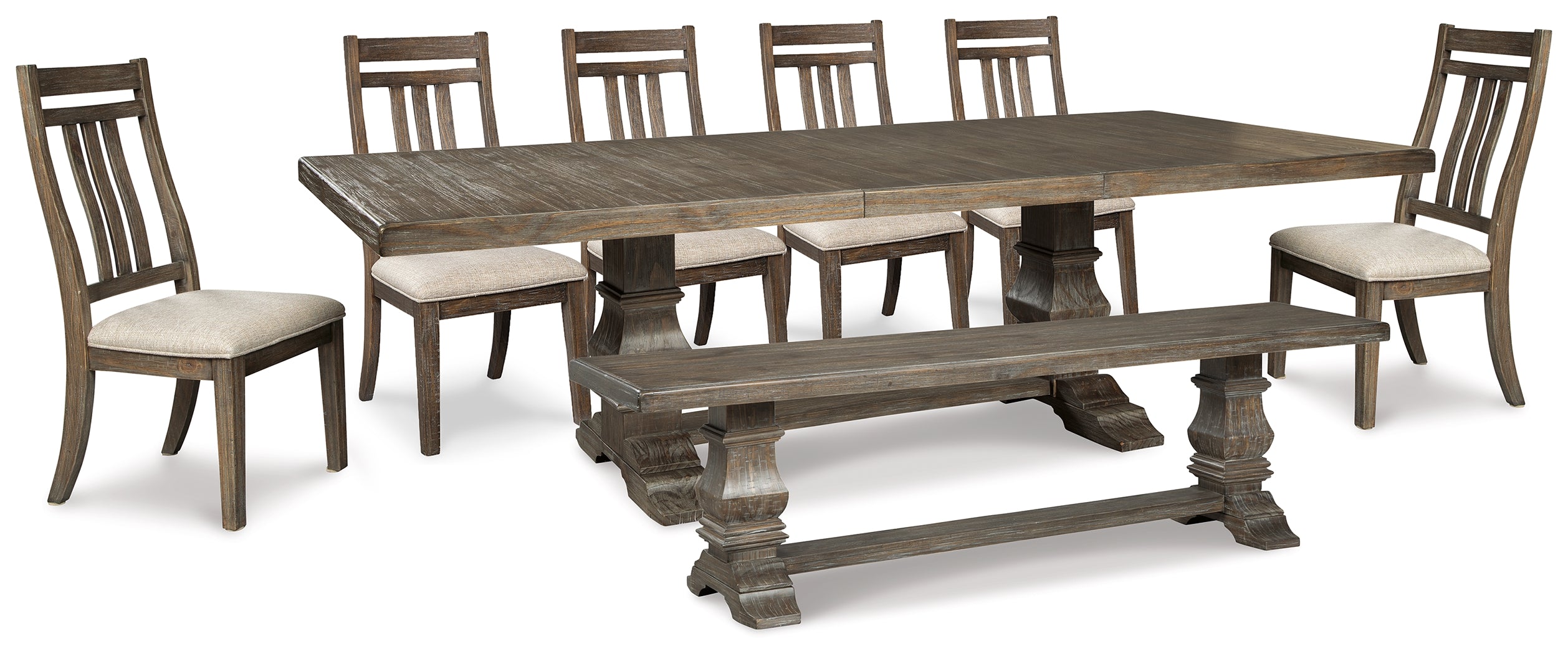 Inspired by heavy and hearty lodge-style furnishings from days gone by, this 8-piece dining set brings the past brilliantly into the present. Enticing with a distressed aged pine color finish with light wire-brushed texture, the richly-styled extension table with drop-in leaf and double pedestal base and dining chairs with textural beige upholstery are reserved for those who appreciate furniture with great presence.