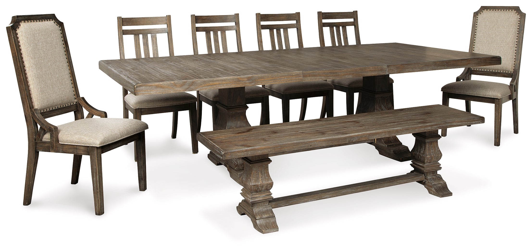 Inspired by heavy and hearty lodge-style furnishings from days gone by, this dining package brings the past brilliantly into the present. An aged pine color finish with light wire-brushed texture is complemented by bent slat design seating with textured beige upholstery. This richly styled package is reserved for those who appreciate furniture with great presence.