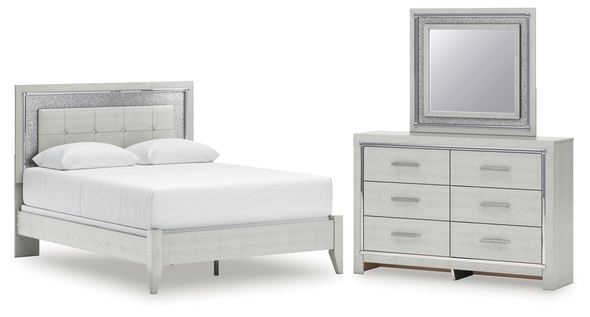 Bright, bold luxury. This bedroom package dazzles with its attention to detail. Your love of glamorous style is reflected in its all-over faux gator in a metallic finish, exquisitely paired with faceted chrome-tone details. With its opulent approach to bedroom style, this set inspires you to live luxuriously every day.